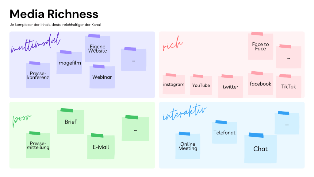 Auf eine kleine Faustformel gebracht, bestimmt die Komplexität eines Themas den notwendigen Kanal: Je komplexer die Botschaft, desto reichhaltiger muss der Kanal sein.